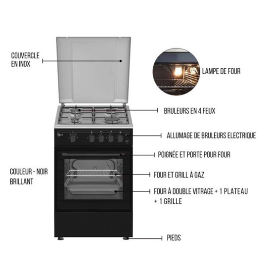 Elle se dote de 4 foyers à allumage électrique et d'un four à chaleur tournante avec une grille et un plateau à four. Vous disposez également d'un allumage du brûleur et un couvercle brûleur en inox. Cette cuisinière à allumage électrique est un modèle à pose libre.